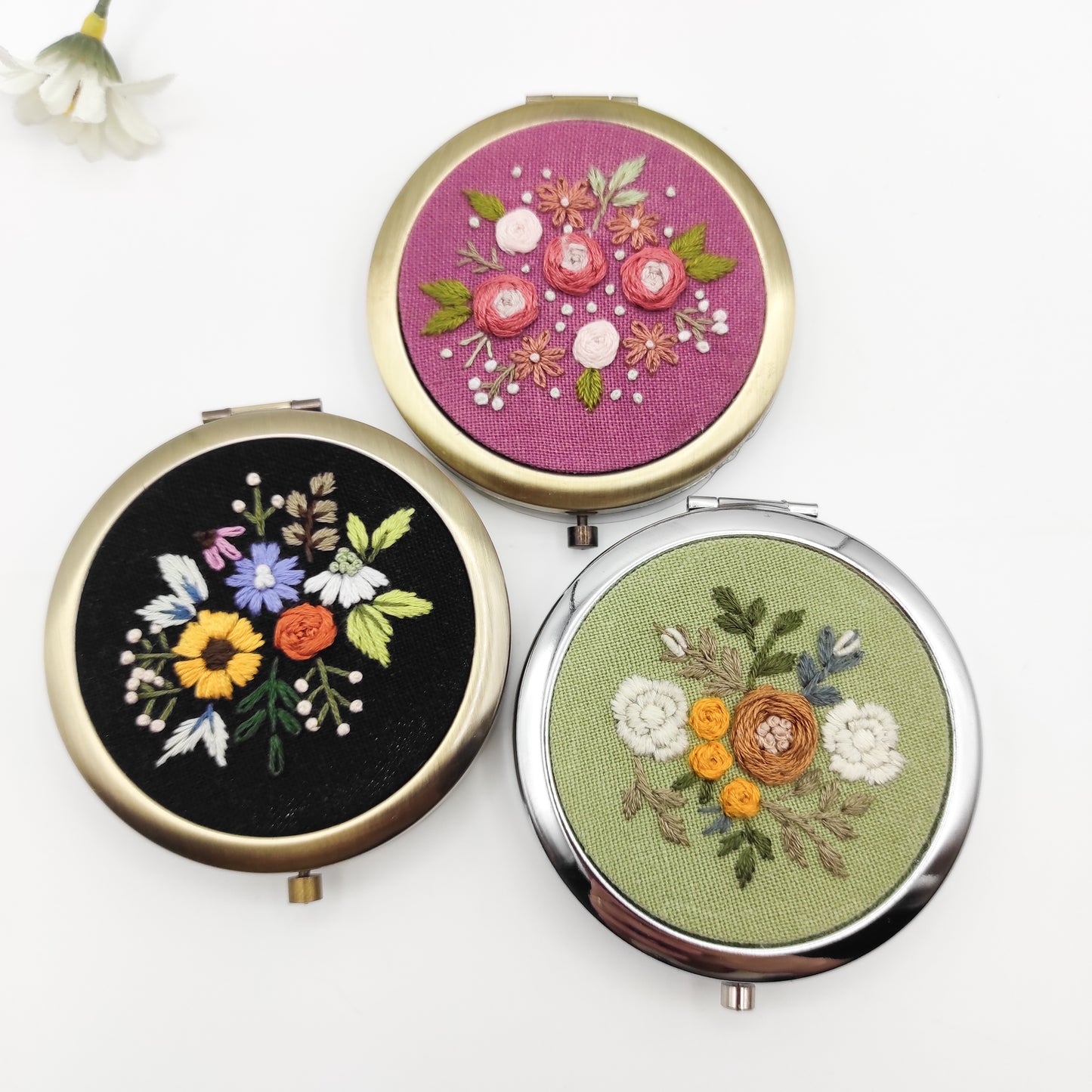 Este paquete de bordado incluye 3 espejos de bolsillo redondos o un diseño de pastillero. Se adapta a un área de bordado de 57 mm (2,25") o a un bastidor de 7,6 cm (3"). Debido a la particularidad del producto, el patrón es pequeño. Recomiendo usar de 2 a 3 hebras para sus proyectos.