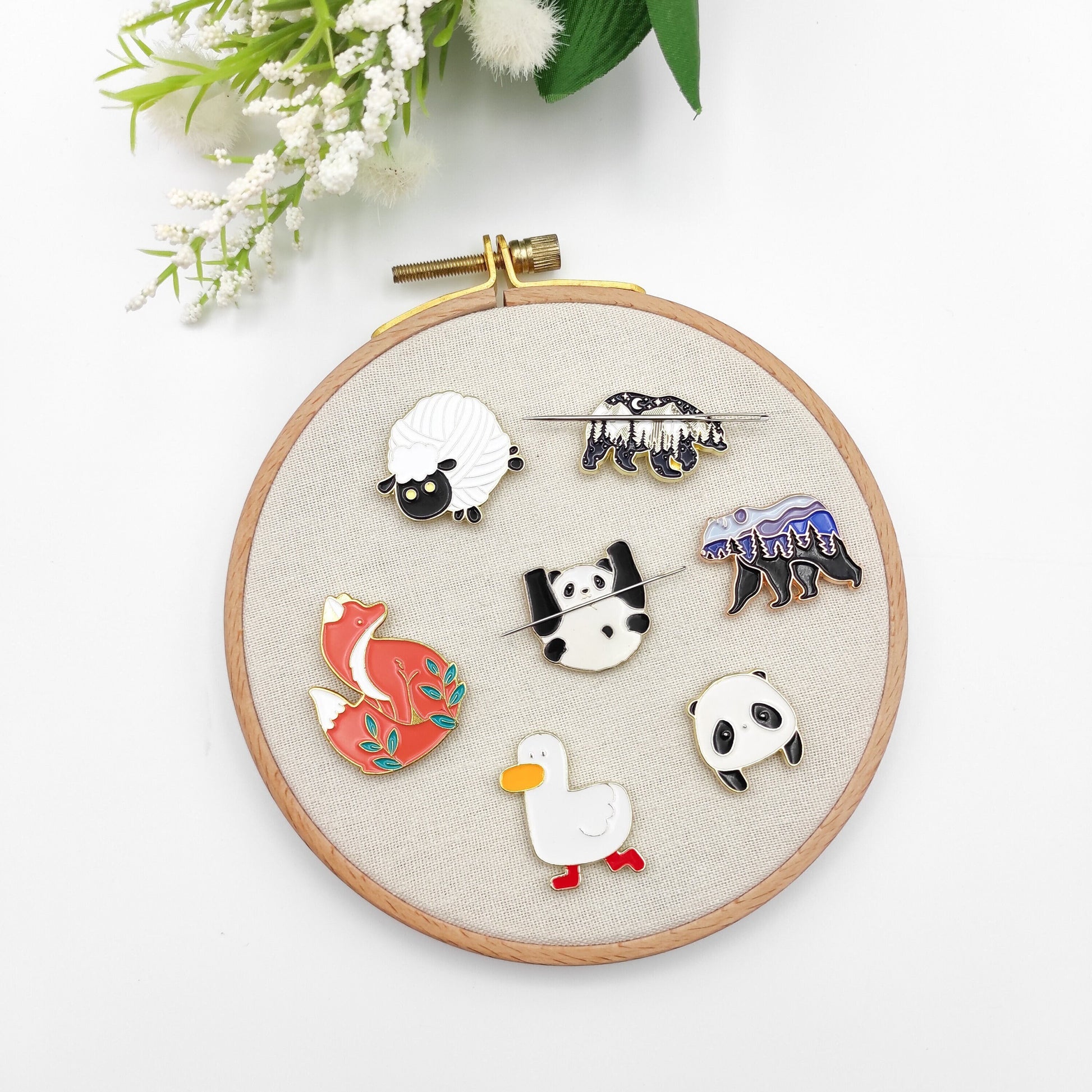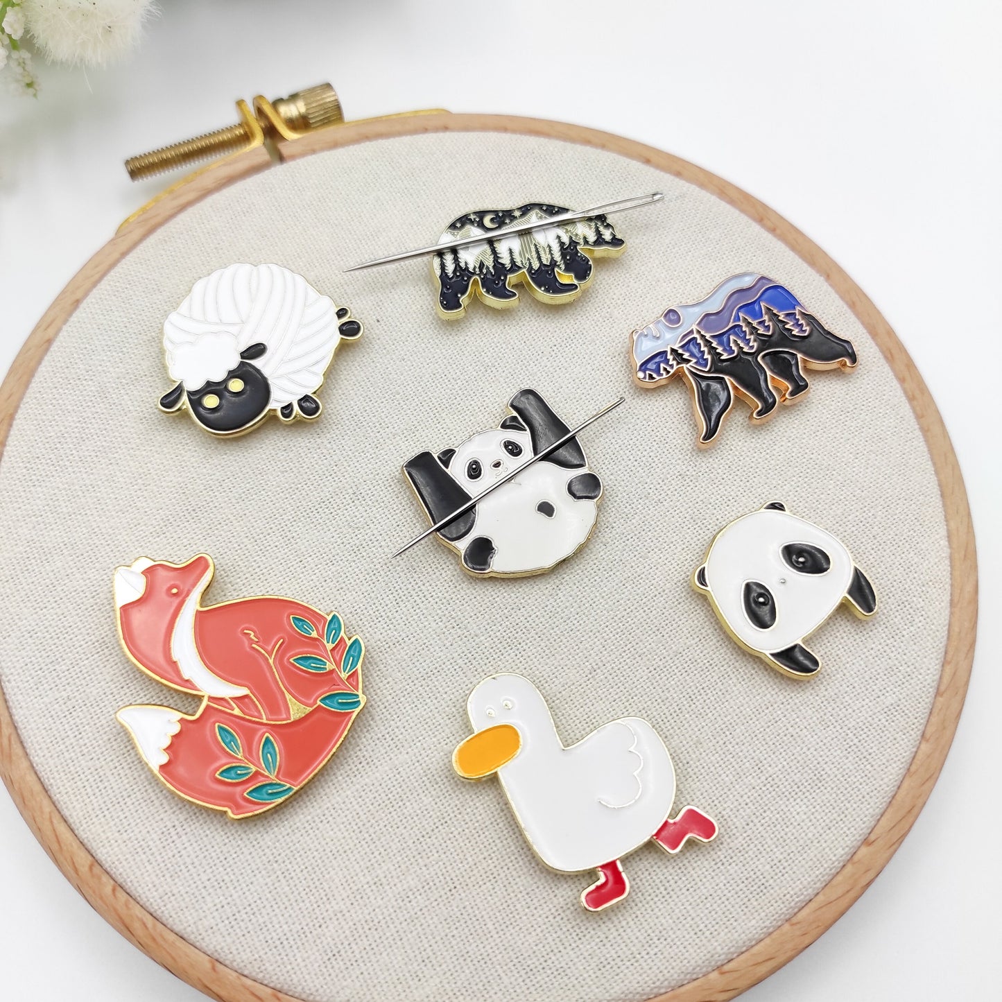 Animal enamel needle minders, Sheep, Bear, Panda, Fox, Duck Needle Minder for Embroidery, Cross Stitch, Needle work, Needle point tools
