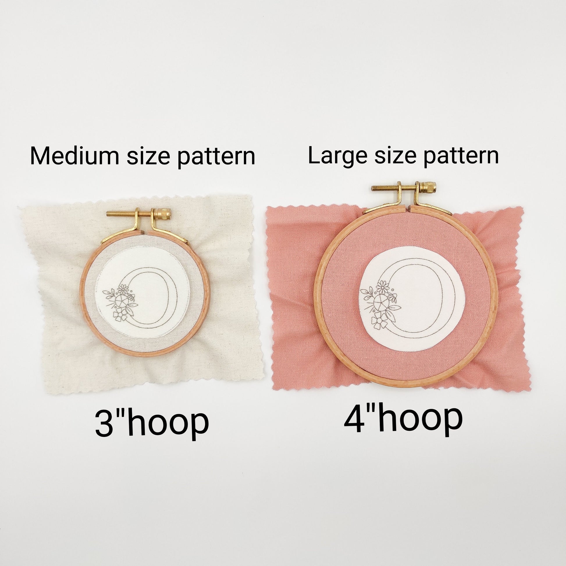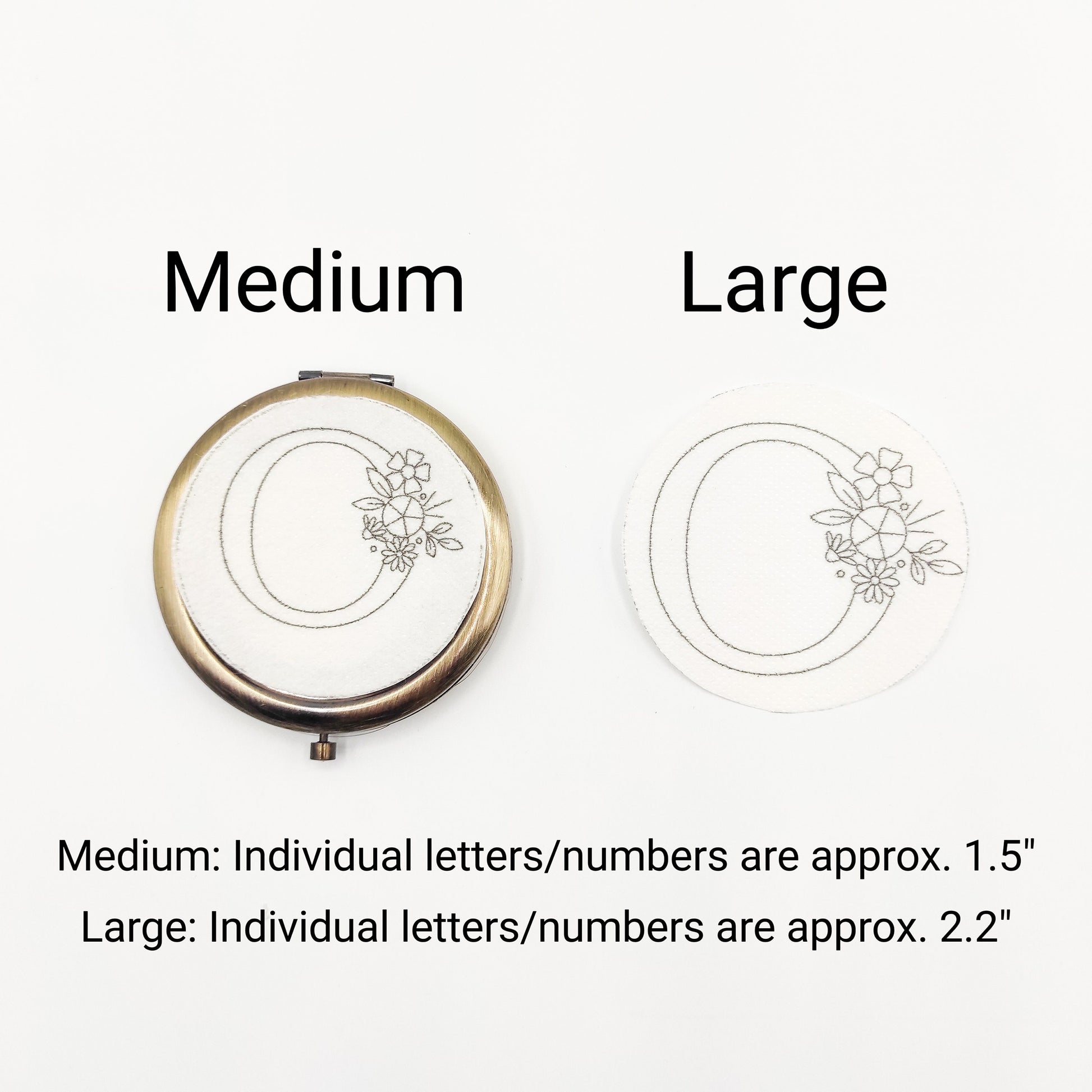 I offer this design in two sizes. A single letter or number in a medium size design is approximately 1.5 inches and they fit in 3 inch embroidery hoop. A single letter or number in large size design is about 2.2 inches. They are fits 4" embroidery hoops. If you are using it for a large pill box or a round pocket mirror, please choose the medium size design.