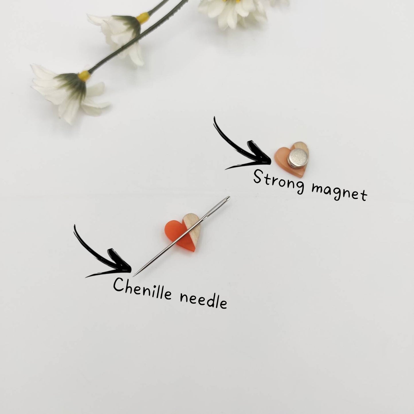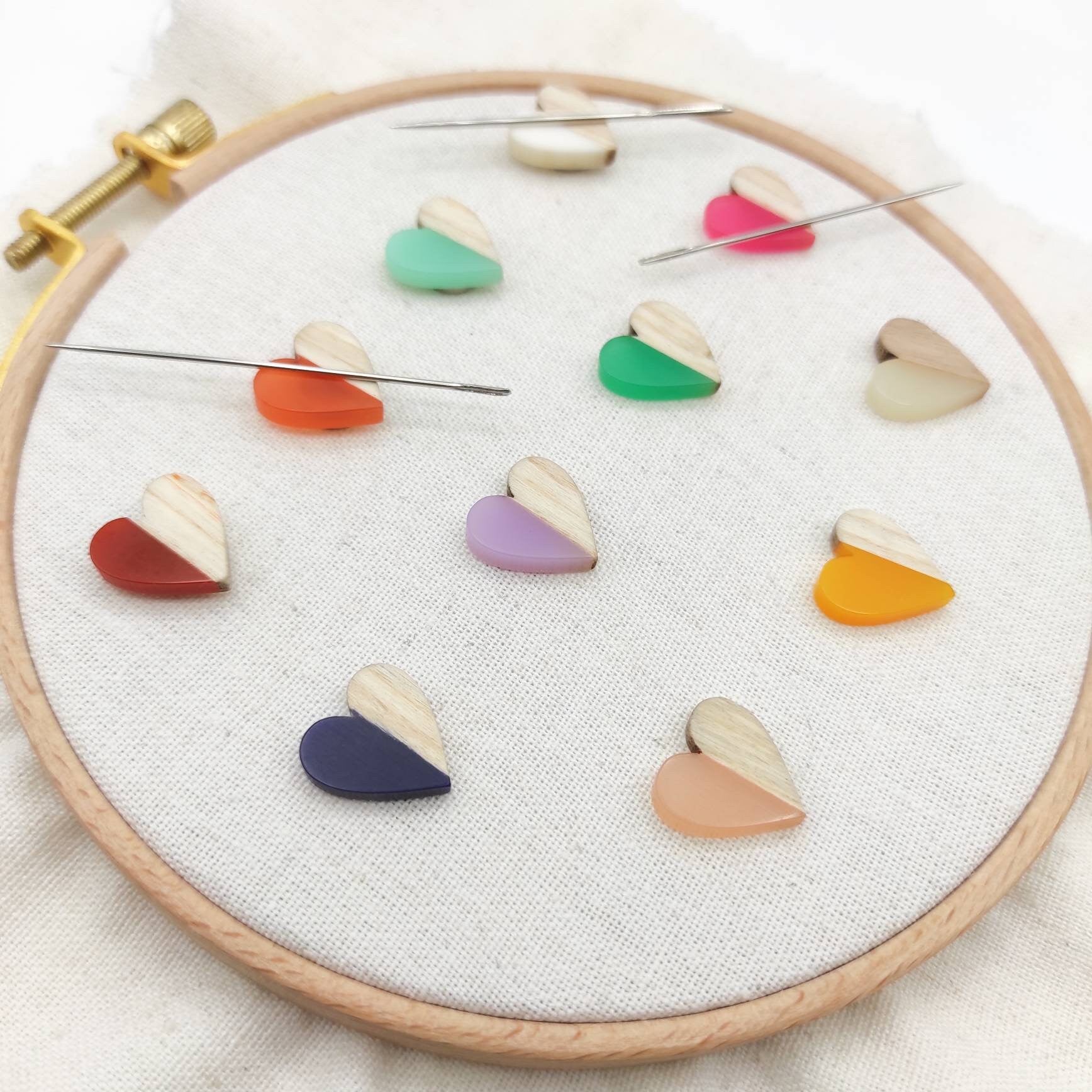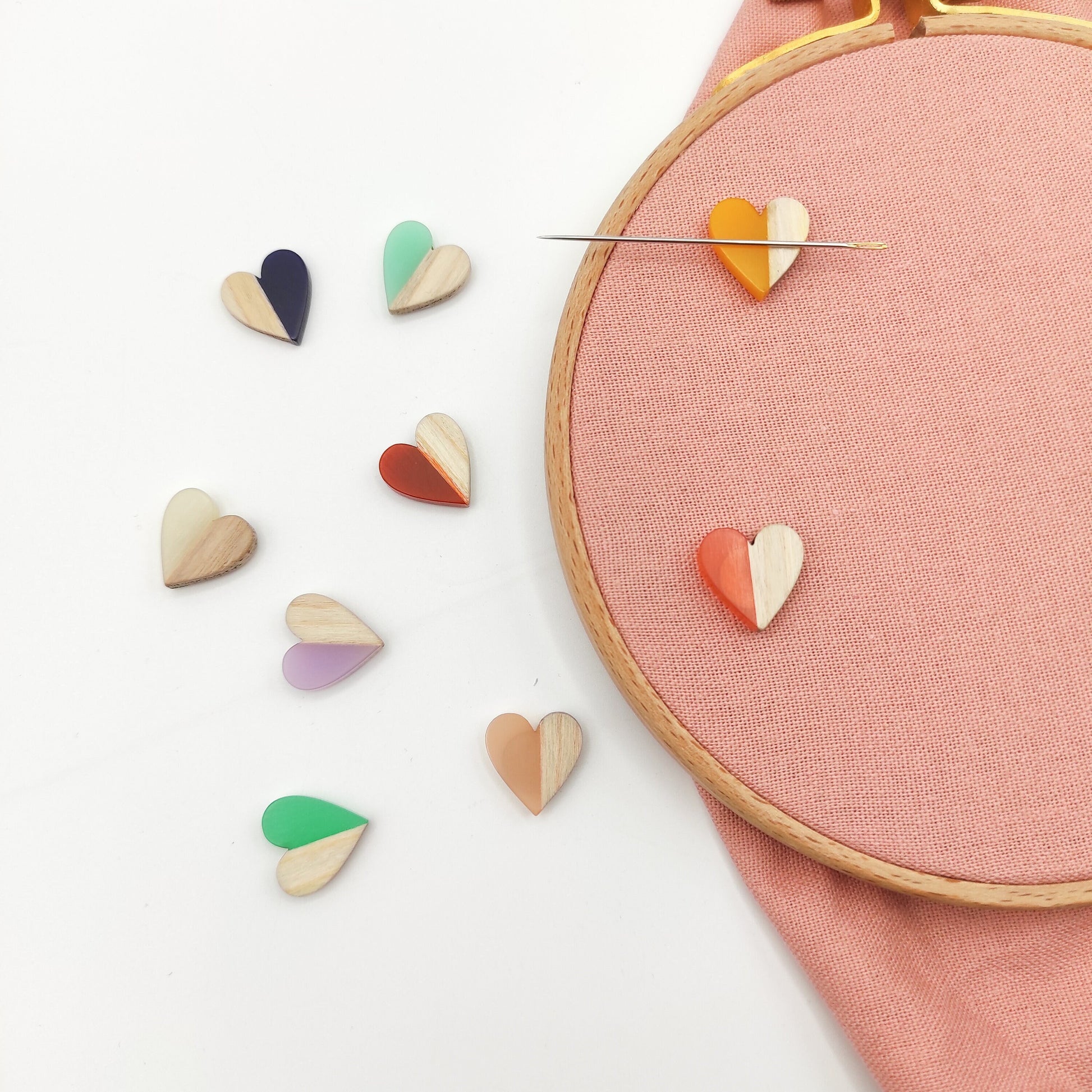 Small Heart Wood and Resin needle minders, Tiny Needle Minder for Embroidery, Cross Stitch, Needle work, needlecraft projects and sewing.