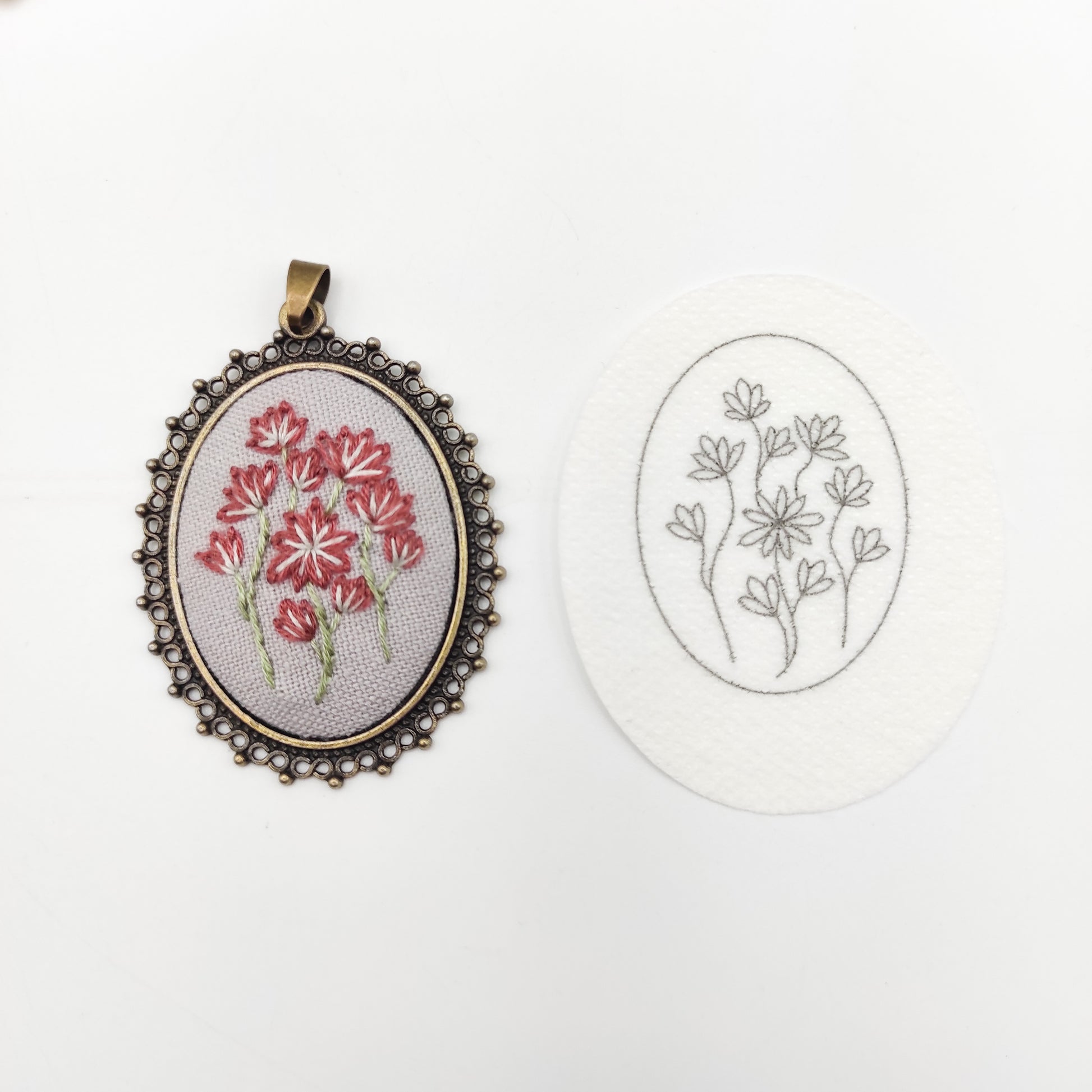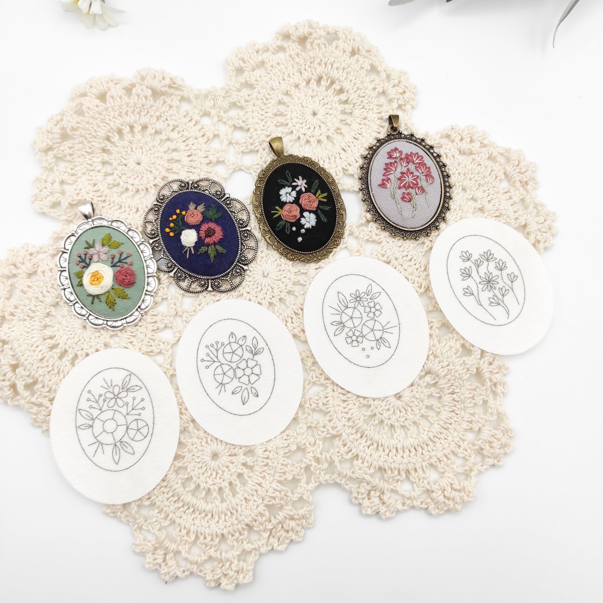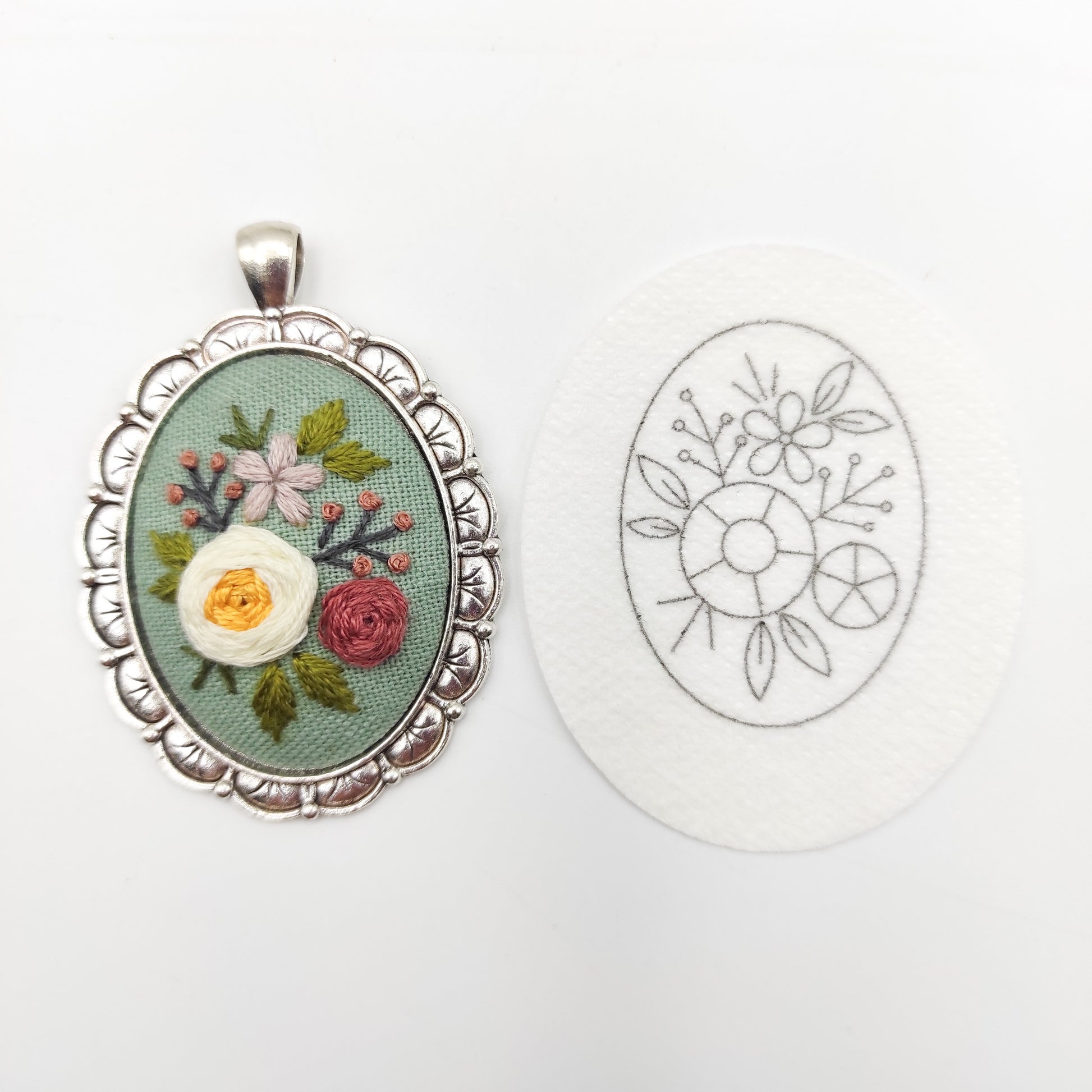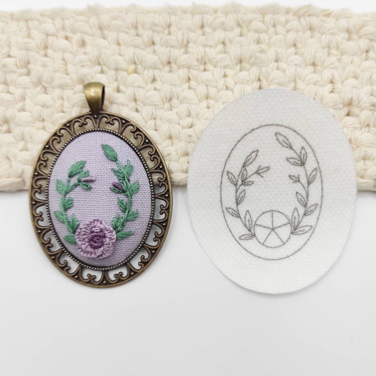 Stick & Stitch embroidery patterns, DIY embroidery floral patterns for oval necklace, water soluble pre-printed embroidery pattern