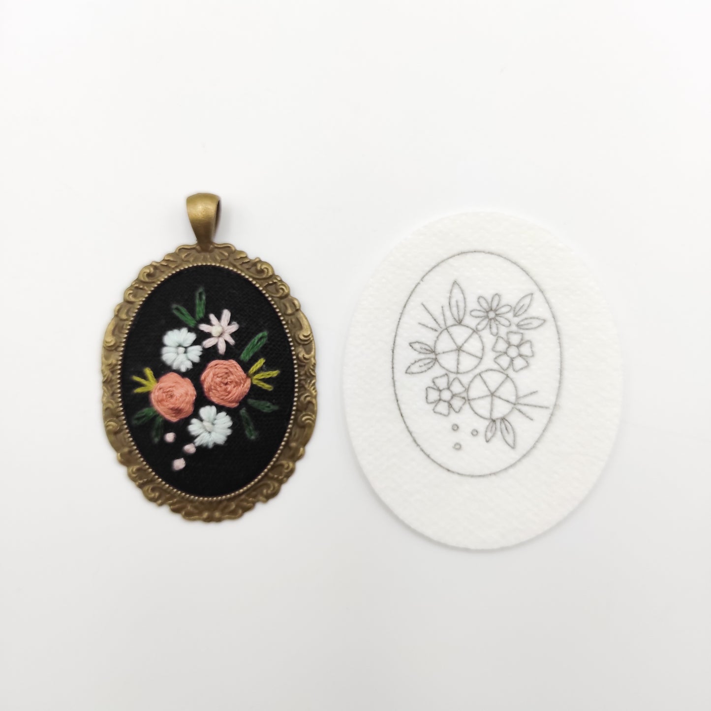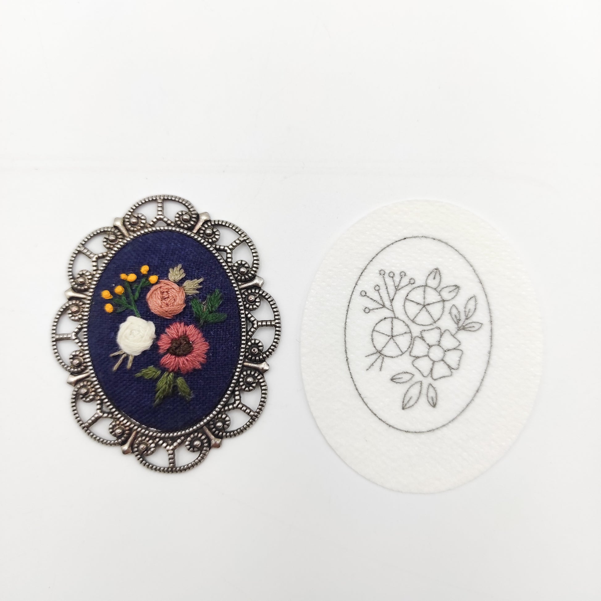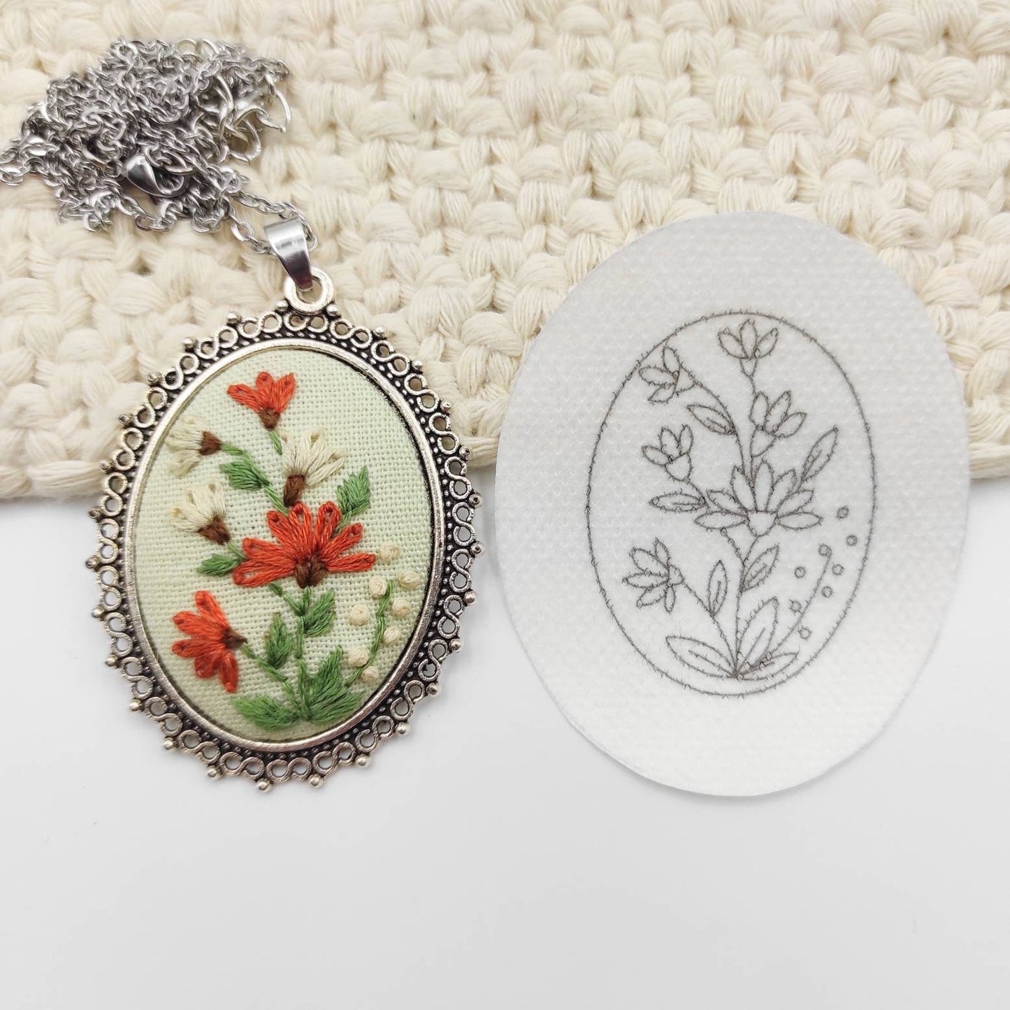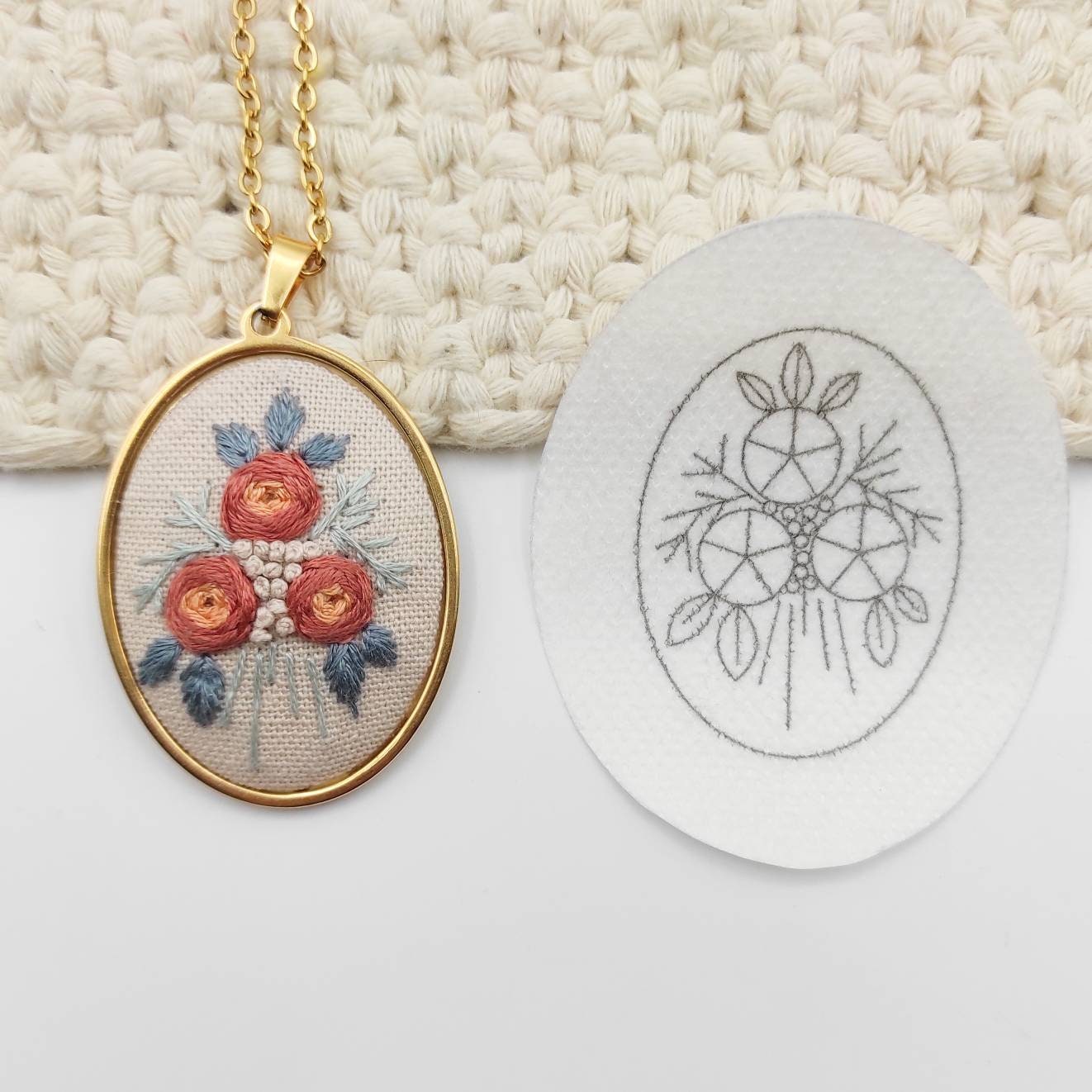 Stick & Stitch embroidery patterns, DIY embroidery floral patterns for oval necklace, water soluble pre-printed embroidery pattern